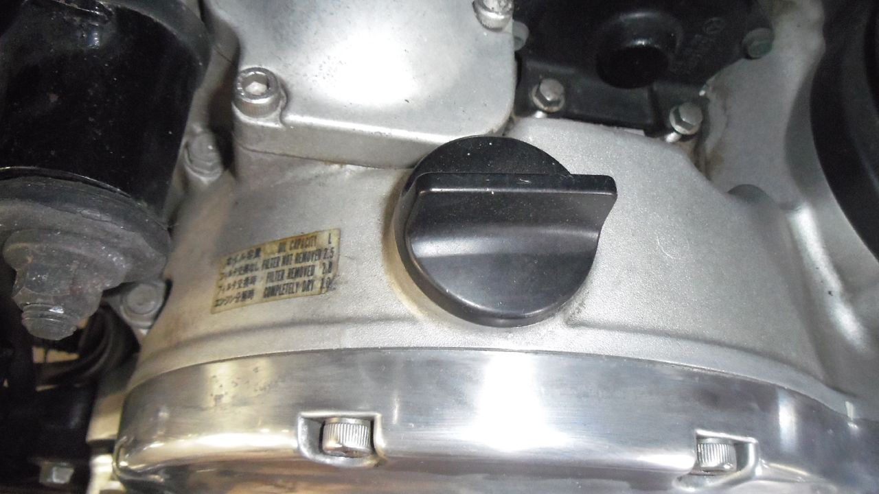 ①エンジンを5分ほどかけて温めてから、エンジンを止め、オイル注入口(クランクケース上)のキャップを外します。※キャップを開けているとスムーズにオイルが排出されます。